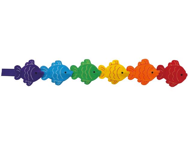 6隻不同顏色的小魚組件,尾巴後方的硬扣可以輕易地黏在其他魚兒的反面,幼兒在玩黏貼遊戲時,能訓練手指撕與貼合的技能。