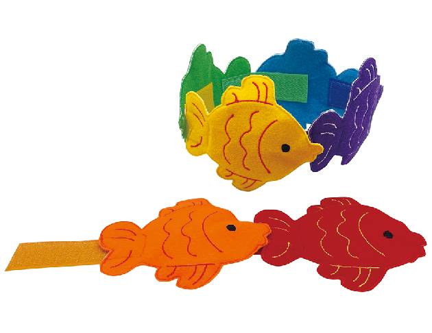 - 黏貼的疏密排列的關係能建構出魚兒追逐的情境;平面與立體的串聯方式,會產生不同的操作玩法;不同數量的組合,可以將組件變成手環或是頭套穿戴。