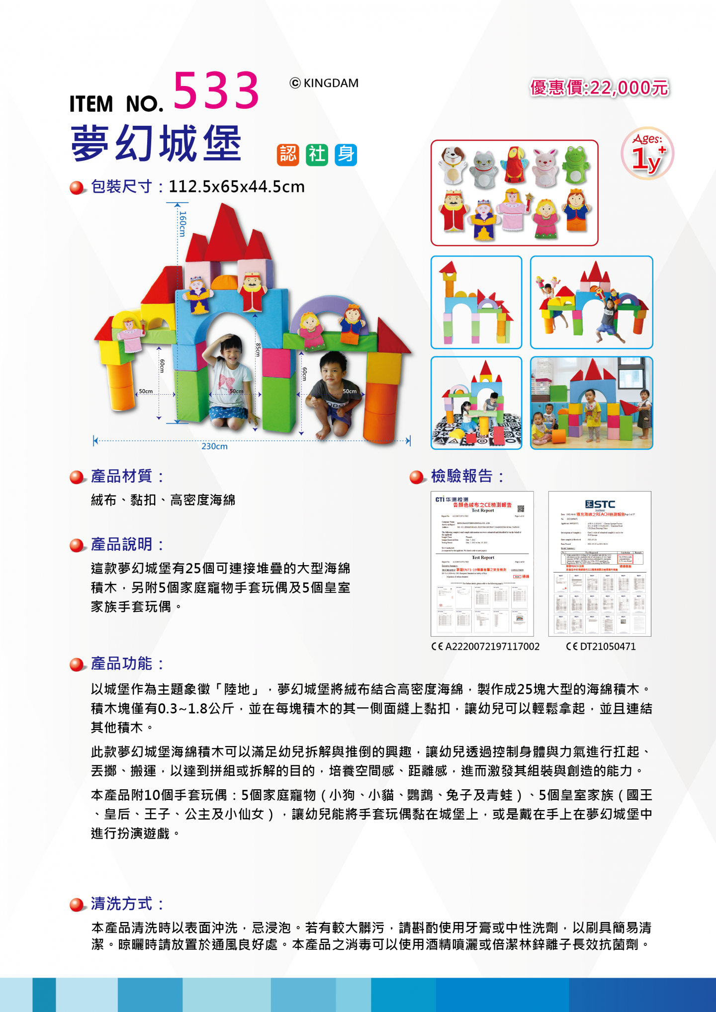這款夢幻城堡有25個可連接堆疊的大型海綿積木,另附5個家庭寵物手套玩偶及5個皇室家族手套玩偶。