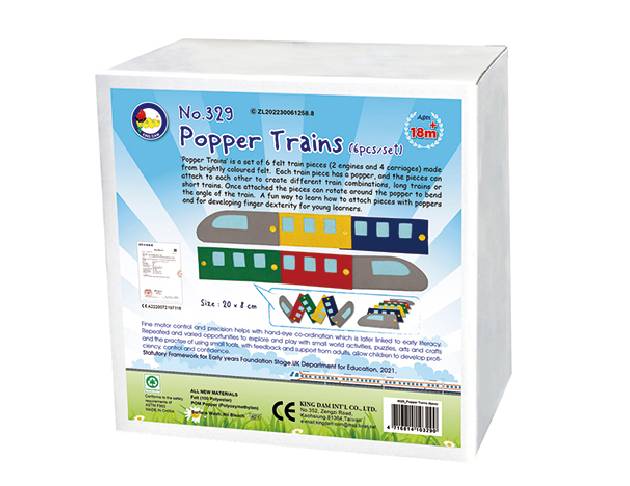 列車組根據按扣分為公扣及母扣的特性,設計了兩個不同方向的列車頭與四色車廂,讓幼兒練習拔與扣的生活技能。