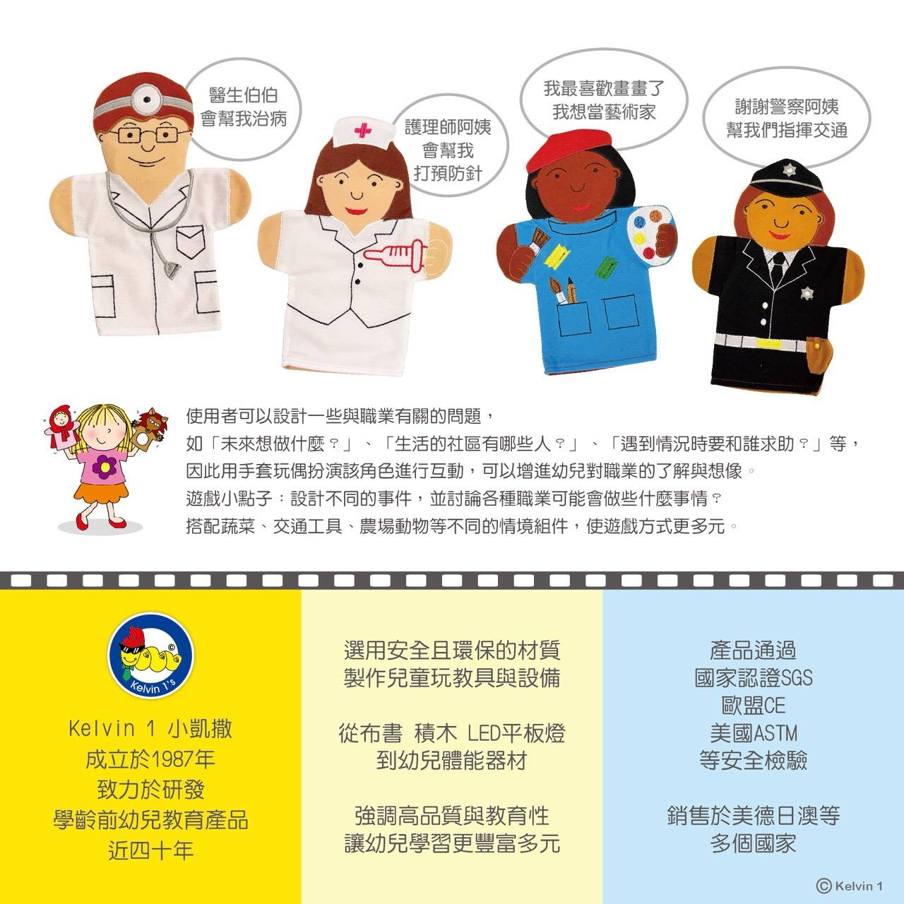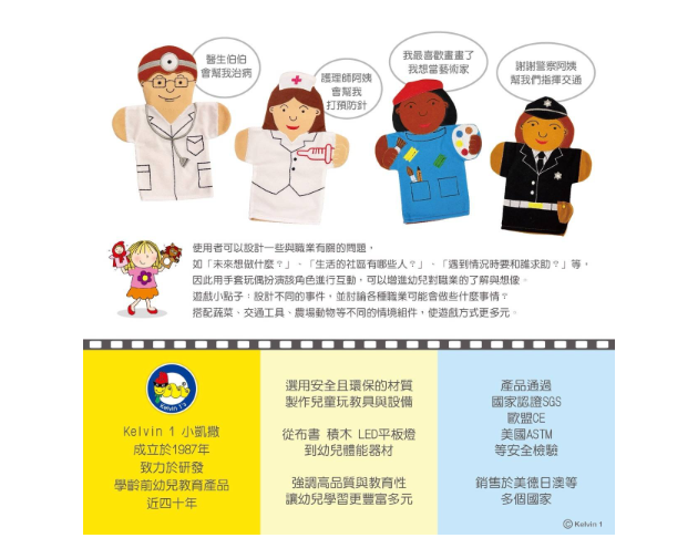 職業手套玩偶能夠幫助孩子們認識各種不同的職業,了解每個職業的角色和責任,可以用來傳遞正確的價值觀和道德觀, 例如: 醫生是關懷人們的健康; 警察是強調法律和秩序的重要性等。 - 角色扮演