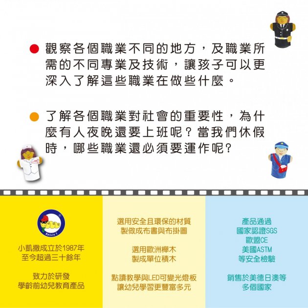 職業手套玩偶展示了職業多樣性的概念,讓孩子們看到各種族裔的人都可以從事各種職業。這有助於培養孩子們對多元文化的尊重和包容。 - 性別平等