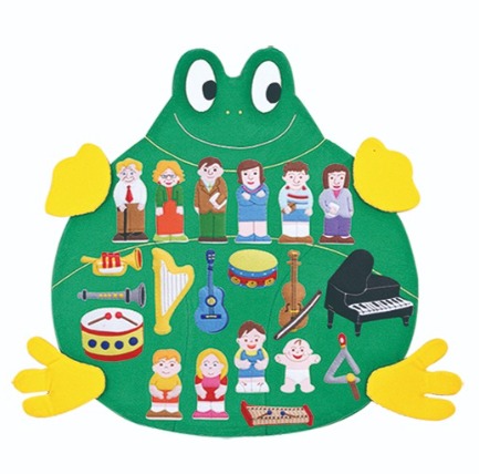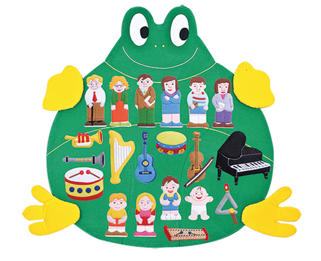 可立在桌面上,也可穿戴在身上的特殊的青蛙布掛板,靈活操作精美的配件與孩子進行有趣的互動。