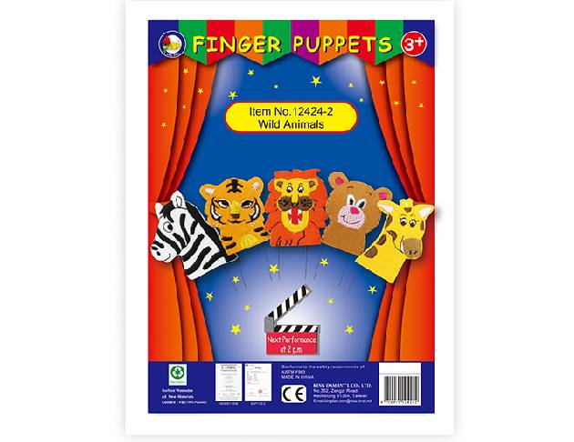 每組有五支手指玩偶:老虎丶斑馬、獅子丶熊及長頸鹿等野生動物。