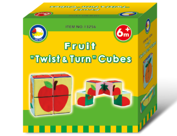 - 這組有趣的旋轉海綿方塊是以特殊方式將4粒海綿方塊縫在一起,讓小孩在扭扭轉轉之間,可以拼組成正方形的水果圖案,有蘋果、橘子、草莓和鳳梨; 另可組成長方形的水果圖案,有西瓜和香蕉。
