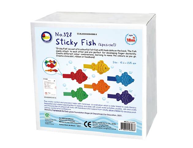 6隻不同顏色的小魚組件,尾巴後方的硬扣可以輕易地黏在其他魚兒的反面,幼兒在玩黏貼遊戲時,能訓練手指撕與貼合的技能。