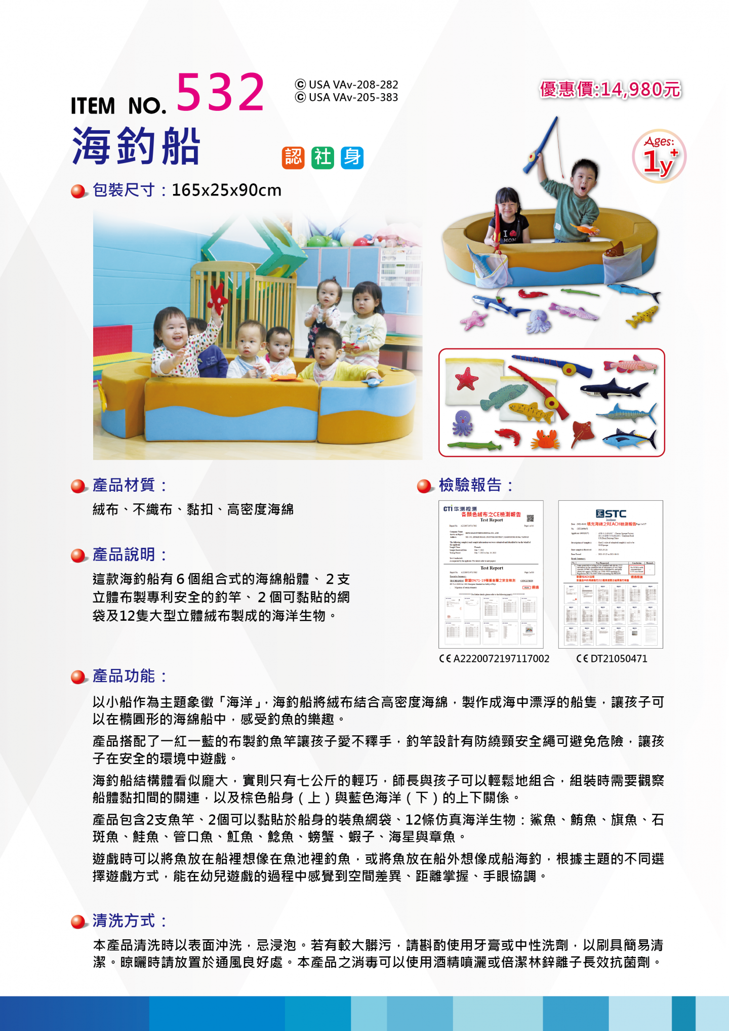 產品搭配了一紅一藍的布製釣魚竿讓孩子愛不釋手,釣竿設計有防繞頸安全繩可避免危險,讓孩子在安全的環境中遊戲。