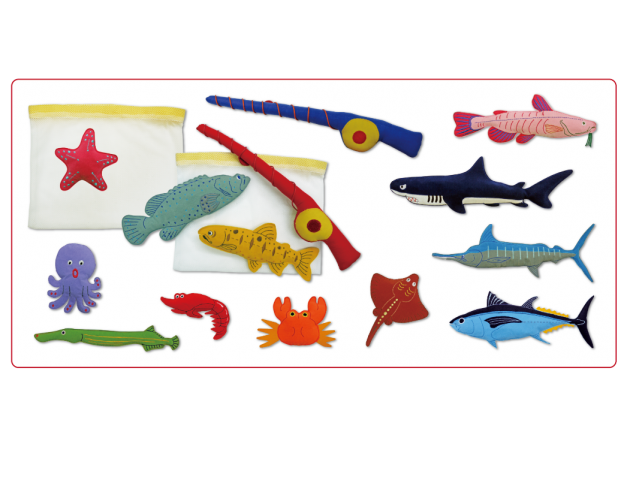 產品包含2支魚竿、2個可以黏貼於船身的裝魚網袋、12條仿真海洋生物:鯊魚、鮪魚、旗魚、石斑魚、鮭魚、管口魚、魟魚、鯰魚、螃蟹、蝦子、海星與章魚。