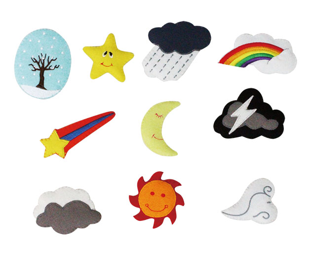 十種常見天氣組件可搭配教學絨布掛板、絨布圍裙等道具,在與孩子互動中用扮演遊戲的方式來進行情境教學。