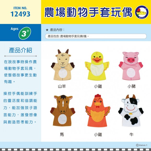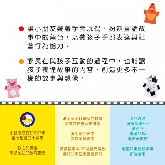 用動物手套玩偶做農場動物的主題教學,會吸引兒童的專注力,讓兒童認識每一種動物的特徵,牠住在那裡?能夠幫人們做些什麼?…等相關的知識。 - 促進兒童的語言能力發展
