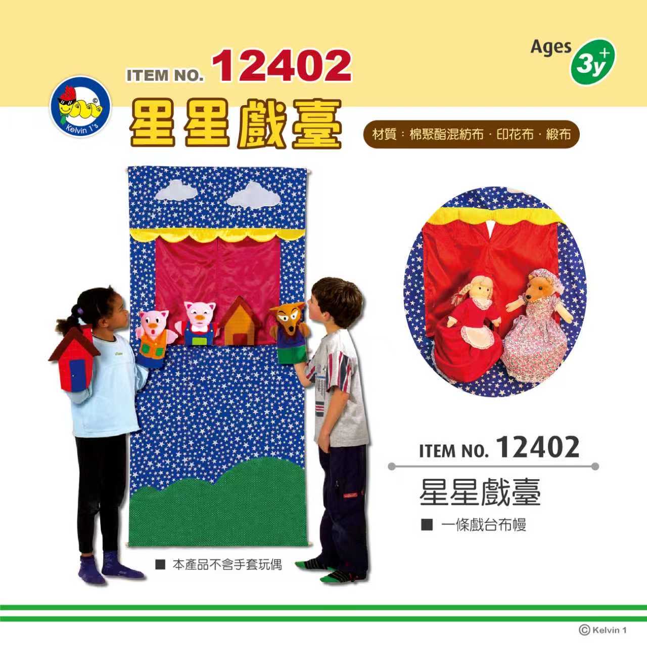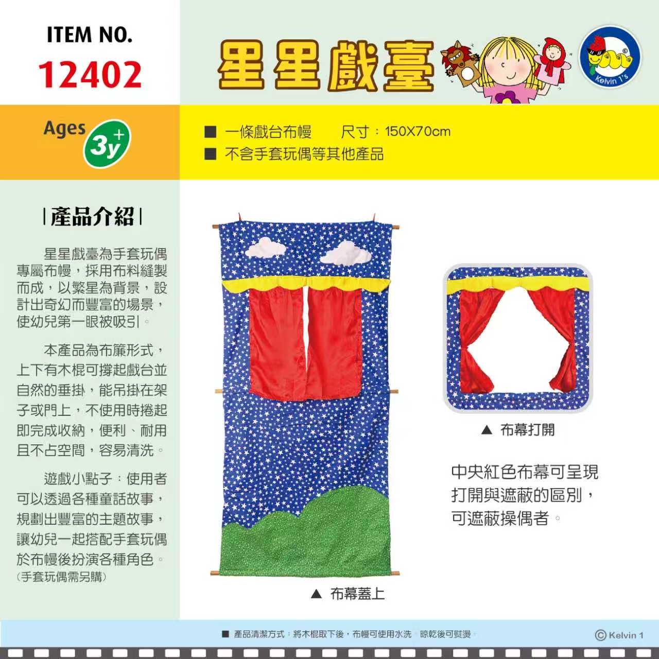 星星戲臺是一款布製的扮演戲臺,上下方皆有木棒。使戲臺支撐平整,老師可以掛在門上或是支架上,讓幼兒藏身於戲臺後方,進行扮演遊戲。戲臺設計的簾幕可以左右拉開或放下,同時可以搭配手套、玩偶進行劇場遊戲。