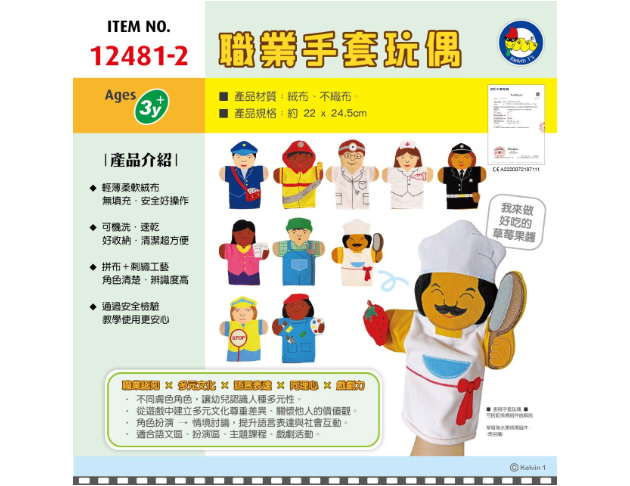 職業手套玩偶能夠幫助孩子們認識各種不同的職業,了解每個職業的角色和責任,可以用來傳遞正確的價值觀和道德觀, 例如: 醫生是關懷人們的健康; 警察是強調法律和秩序的重要性等。 - 角色扮演